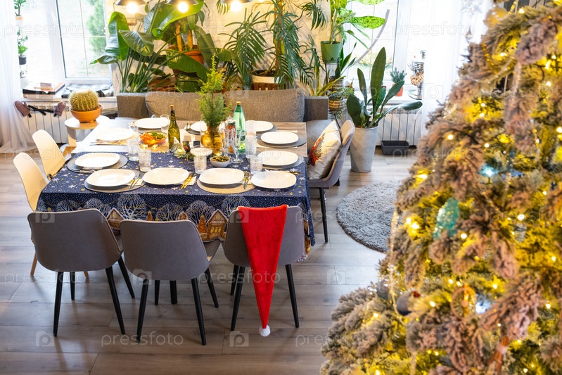 Праздничный стол, установленный для гостей на Рождество и Новый год, рождественская елка в гостиной, тарелки, бутылки, стаканы, горшечные растения, сказочные огни
