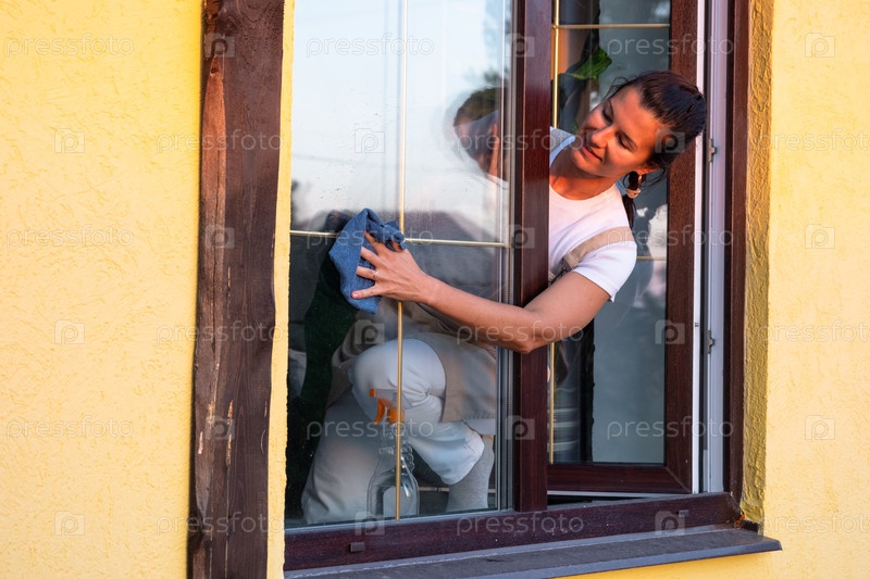 Женщина в фартуке вручную моет окно дома тряпкой с распылителем и шваброй снаружи. Безопасность на высоте, восстановление порядка и чистоты весной, уборка