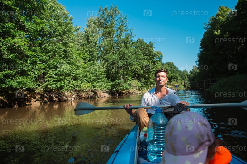 Семейная поездка на байдарках. Отец и дочь гребят на лодке по реке, водный поход, летнее приключение. Экологичный и экстремальный туризм, активный и здоровый образ жизни