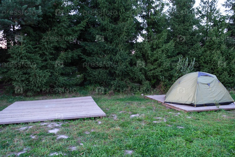 Установлена туристическая палатка в кемпинге на природе в лесу. Внутренний туризм, активные летние каникулы, семейные приключения. Экотуризм, спорт, поход. Копировать пространство, высмеивать