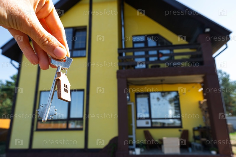 Ключ к дому с крошечным домом в руках владельца рядом с коттеджем - продажа, переезд, бронирование, проект коттеджа, ипотека, страхование жилья и недвижимости