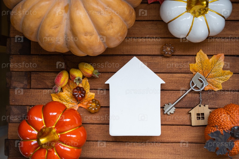 Уютный макет дома высмеивают на деревянном фоне планок с тыквами, осенними листьями, домом и ключами - осеннее настроение, Хэллоуин, жилье, переселение, ипотека, страхование