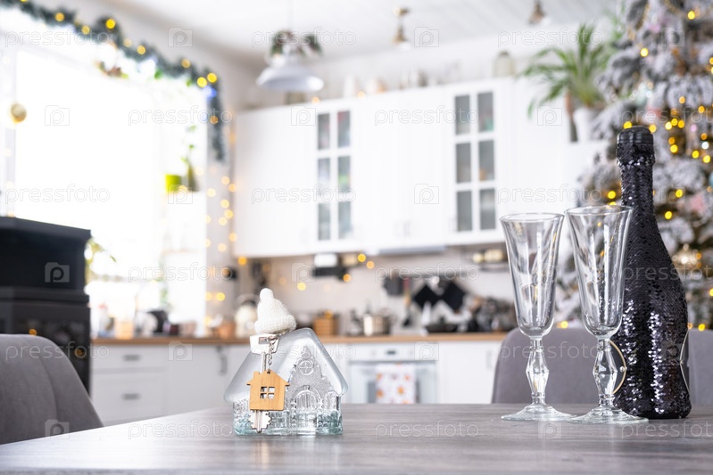 Ледяной прозрачный дом с ключом на столе уютной белой кухни с елкой и рождественским декором с гирляндными огнями. Жилье, интерьер, ремонт, ипотека, аренда в Новый год