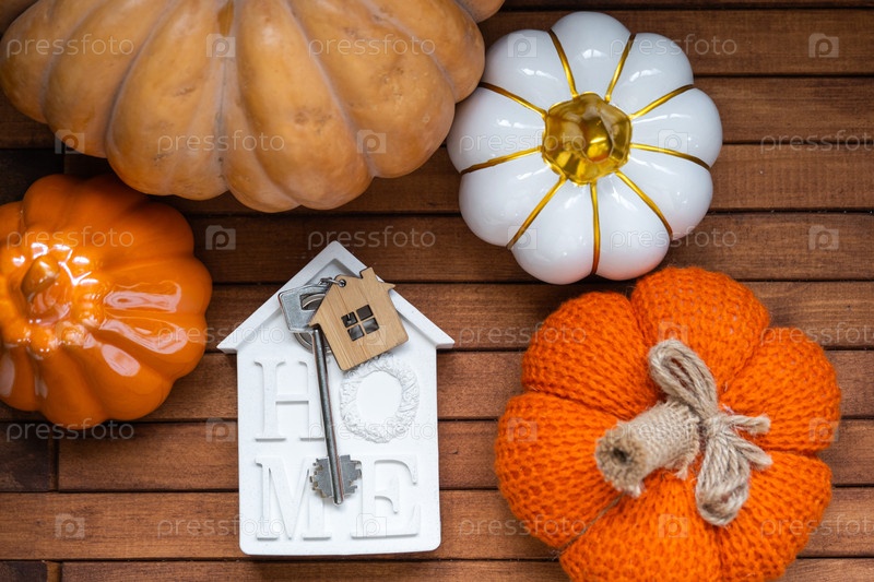 Уютная планировка на деревянном фоне планок с тыквами, осенними листьями, домом и ключами - осеннее настроение, Хэллоуин, жилье, переселение, ипотека, страхование