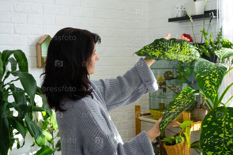 Пересадка и уход за домашним растением dieffenbachia Cheetah в новый горшок в домашнем интерьере. Женщина разводит и выращивает растения как хобби, держит вариетальную диффенбахию с большими пятнистыми листьями, больших размеров