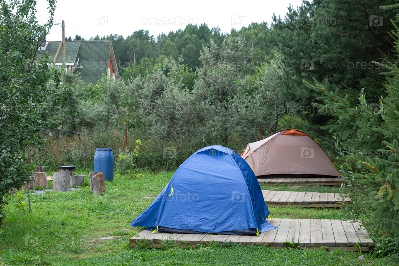 Установлена туристическая палатка в кемпинге на природе в лесу. Внутренний туризм, активные летние каникулы, семейные приключения. Экотуризм, спорт, поход. Копировать пространство, высмеивать
