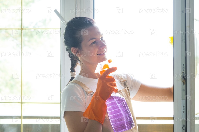 Женщина Портрет в резиновых перчатках и фартук вручную моет оконный балкон дома тряпкой и шваброй внутри интерьера. Восстановление порядка и чистоты весной, уборка сервиза
