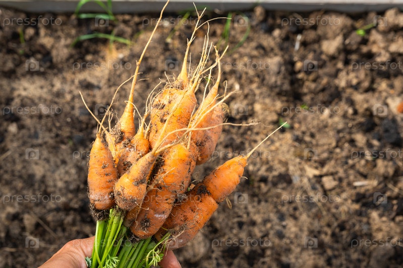 Сбор урожая моркови с верхушками на кровати в руках фермера. Копируйте пространство. Праздник урожая, подарки осени, выращивание экологически чистых продуктов