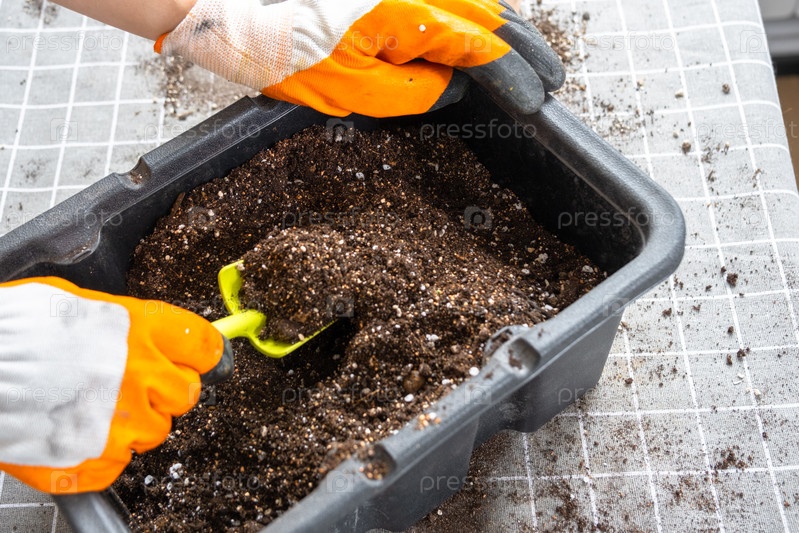 Ингредиенты для почвы домашних горшечных растений, торфа, земли, песка, перлита, вермикулита, кокоса. Смесь для посадки растений в перчатках цветочника смешивают в контейнере