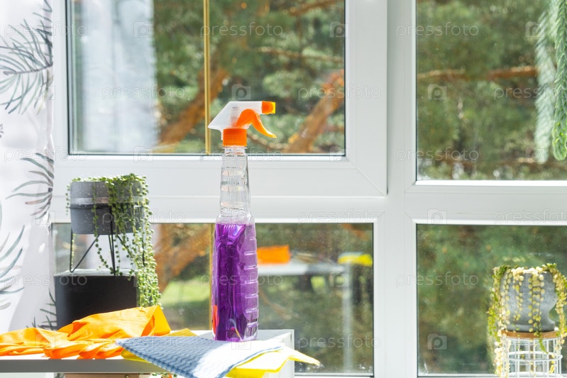 Оконные чистящие средства лежат на подоконнике тряпкой, спреем, моющим средством. Весенняя уборка в доме, уборка