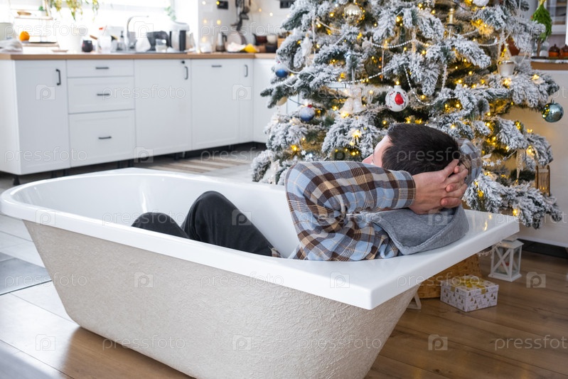 Мужчина лежит отдыхающим в Новой ванне под елкой в качестве новогоднего подарка в интерьере белой декорированной кухни. Реконструкция и дизайн интерьера, строительство и улучшение дома