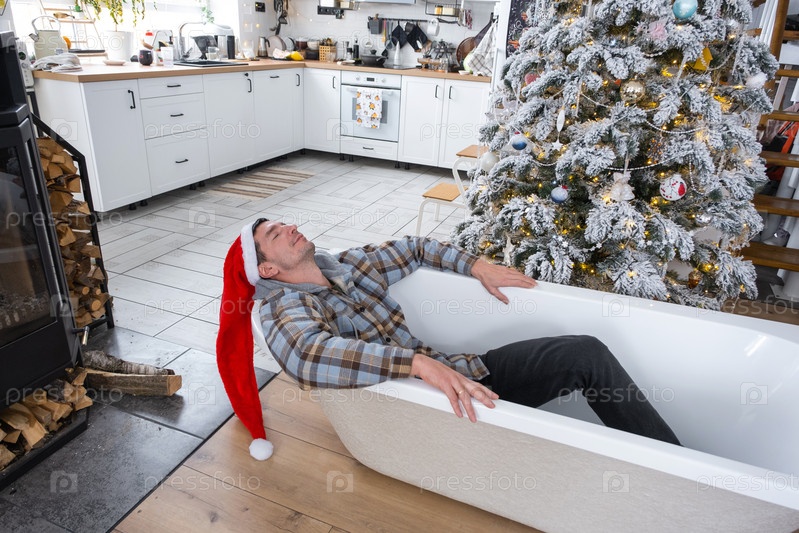 Человек в шляпе Санта лежит отдыхающим в Новой ванне под елкой в качестве новогоднего подарка в интерьере белой декорированной кухни. Реконструкция и дизайн интерьера, строительство и улучшение дома