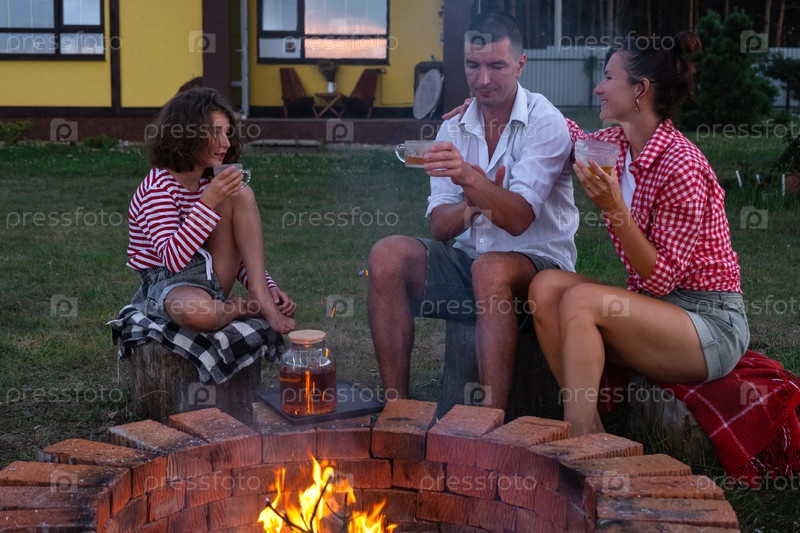 Семья мамы, папы, дочери пьют чай во дворе дома у пожарной ямы уютным летним вечером