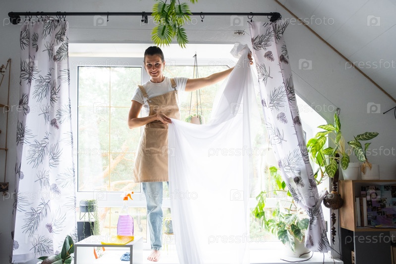 Женщина в фартуке вешает прозрачные тюльские шторы на большие чердачные окна в доме внутри интерьера с горшечными растениями. Весенняя уборка, уборка
