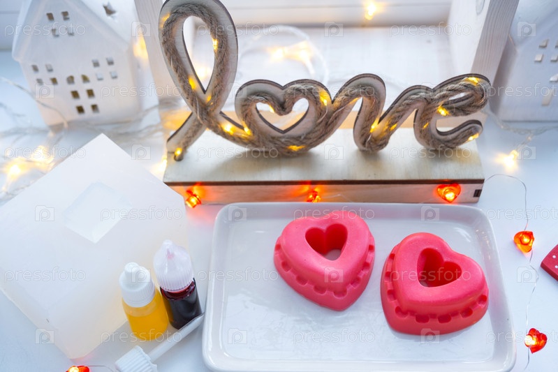 Домашнее мыло ручной работы в форме сердца для подарка на День святого Валентина любимой. Парфюмерия и красители, мыльная основа на столе