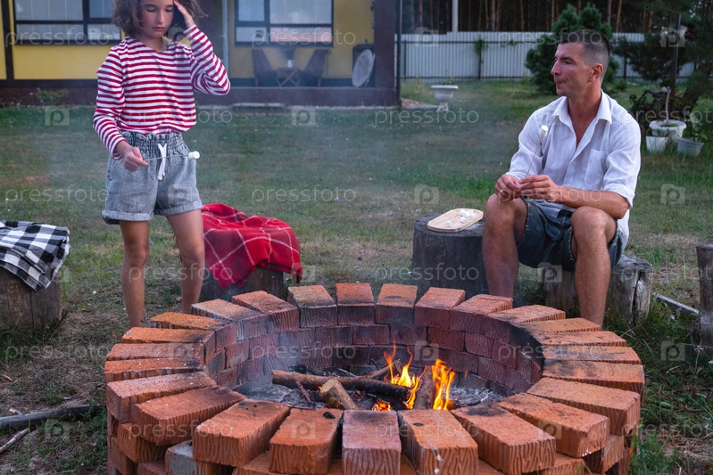 Семья мама, папа, дочь жарят зефир на шашлыках на костре в очаге во дворе дома у пожарной ямы уютным летним вечером