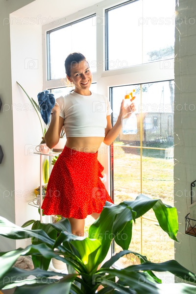 Портрет Женщина с моющим средством, вручную моет окно дома тряпкой и шваброй внутри интерьера с домашними растениями. Восстановление порядка и чистоты весной, уборка сервиза