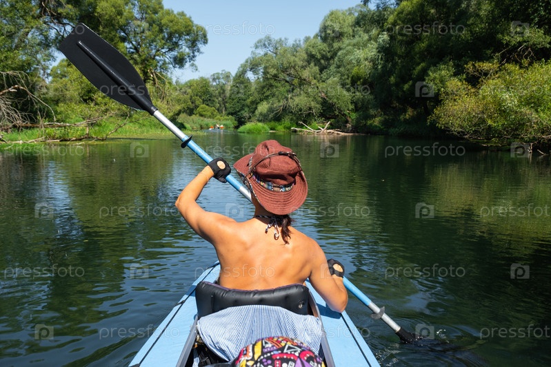 Семейная поездка на байдарках. Мама и дочь гребят на лодке по реке, водный поход, летнее приключение. Экологичный и экстремальный туризм, активный и здоровый образ жизни