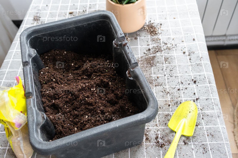 Ингредиенты для почвы домашних горшечных растений, торфа, земли, песка, перлита, вермикулита, кокоса. Смесь для посадки растений в перчатках цветочника смешивают в контейнере