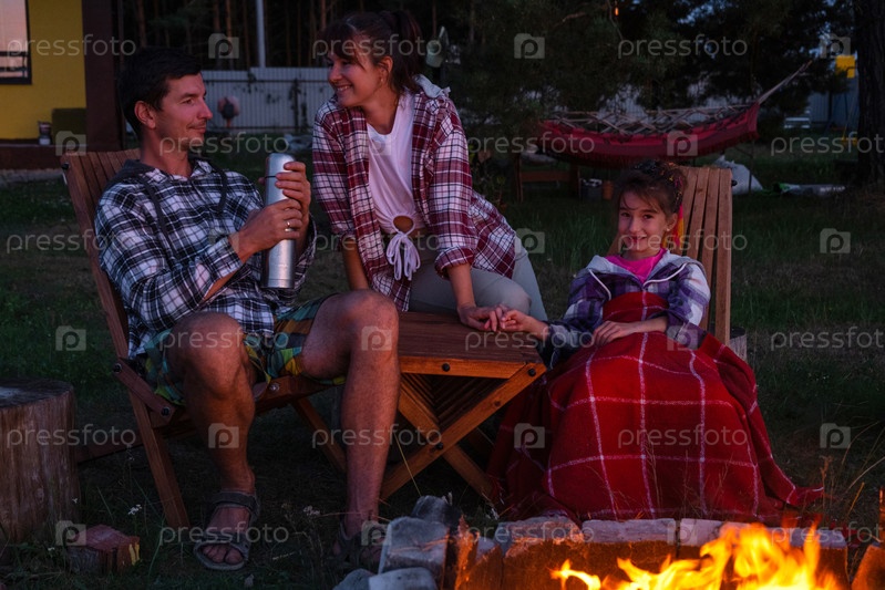 Семья сидит у открытого костра во дворе дома на креслах для кемпинга, пьет чай из термоса, разминается и болтает у очага