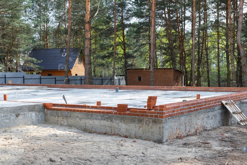 Бетонная плита фундамента дома с проложенными трубами начала строительства по проекту. Строительство коттеджей, проектирование, инженерные коммуникации
