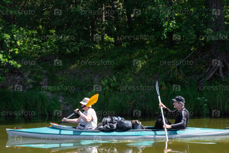 Семейная поездка на байдарках для сеньора и сеньоры. Пожилая супружеская пара гребля на лодке по реке, поход по воде, летнее приключение. Возрастные виды спорта, умственная молодость и здоровье, туризм, активная старость