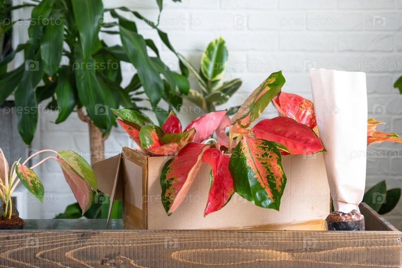 Распаковка красных аглаонем из яслей питомника - заказ завернутых тропических растений, доставка. Продажа, безопасная отправка растений из магазина, упаковка. Цветочный магазин, домашний бизнес
