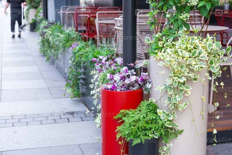 Наружное озеленение - горшки и плантаторы на городской улице с наружными цветами фиалки, маригольды, плющ. Украшение кафе, окна дома с клумбами с цветущими растениями