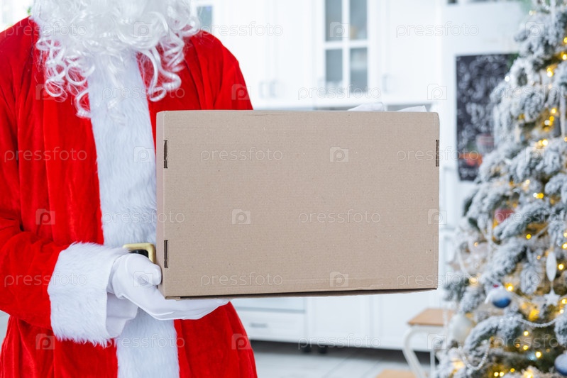 Курьер одет как Санта с коробкой на кухне с белыми рождественскими украшениями и рождественской елкой. Доставка подарков на Новый год и Рождество, курьерская служба