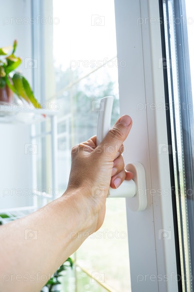 Рука держит рукоятку пластикового стеклопакета, закрывая и открывая окно поворотным механизмом, положение рукоятки для вентиляции, микровентиляции