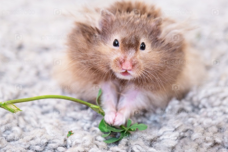 Забавный пушистый сирийский хомяк ест зеленую ветку клевера, набивает себе щеки. Питание для грызунов, витамины. Закрытие