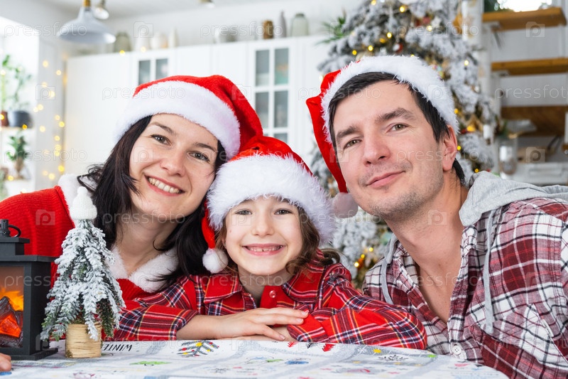 Счастливая традиционная семья папы, мамы, дочери в праздничных шляпах Санты на белой кухне с елкой и декором. Новый год, семейные ценности