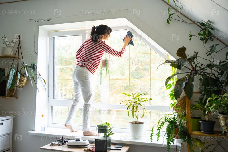 Женщина вручную моет окно дома тряпкой и шваброй внутри интерьера с домашними растениями на подоконнике с чердаком. Восстановление порядка и чистоты весной, уборка сервиза
