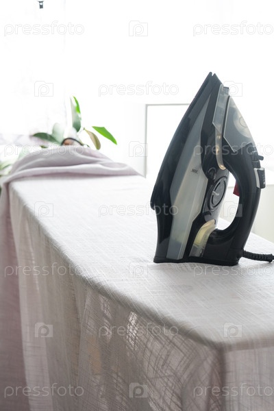 Железо находится на гладильной доске с простой тканью в комнате крупным планом