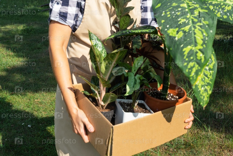 Флорист упаковывает комнатные растения в коробку для доставки покупателю. Продажа, безопасная отправка растений из магазина, посылка. Цветочный магазин, домашний малый бизнес, питомник