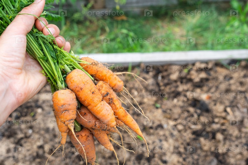 Сбор урожая моркови с верхушками на кровати в руках фермера. Копируйте пространство. Праздник урожая, подарки осени, выращивание экологически чистых продуктов