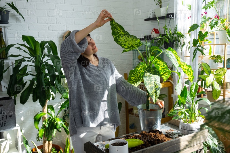 Пересадка и уход за домашним растением dieffenbachia Cheetah в новый горшок в домашнем интерьере. Женщина разводит и выращивает растения как хобби, держит вариетальную диффенбахию с большими пятнистыми листьями, больших размеров