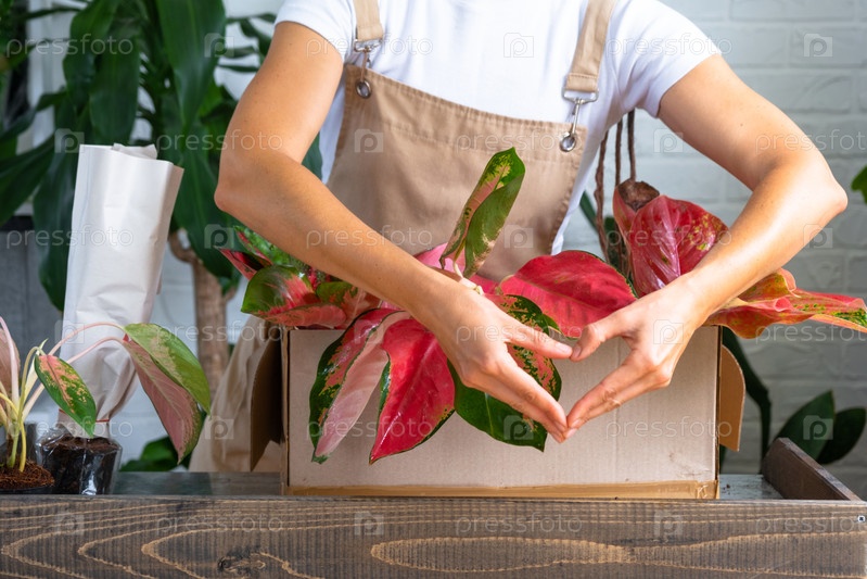 Женщина распаковывает коробку с посылкой горшечных цветов красного аглаонема - заказ завернутых тропических растений, доставка. Продажа, безопасная отправка растений из магазина, упаковка. Цветочный магазин, домашний бизнес