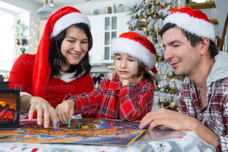 Счастливая традиционная семья папы, мамы, дочери в праздничных шляпах Санта Игра в настольную игру за столом на белой кухне с елкой и декором. Новый год, семейные ценности