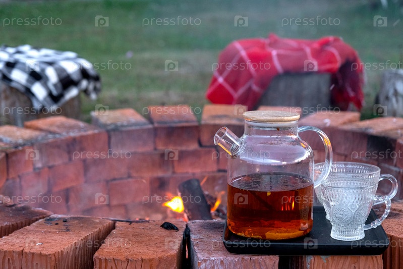 Прозрачный чайник с чаем, чашки на подносе на кирпичной огненной яме во дворе дома в уютный летний вечер