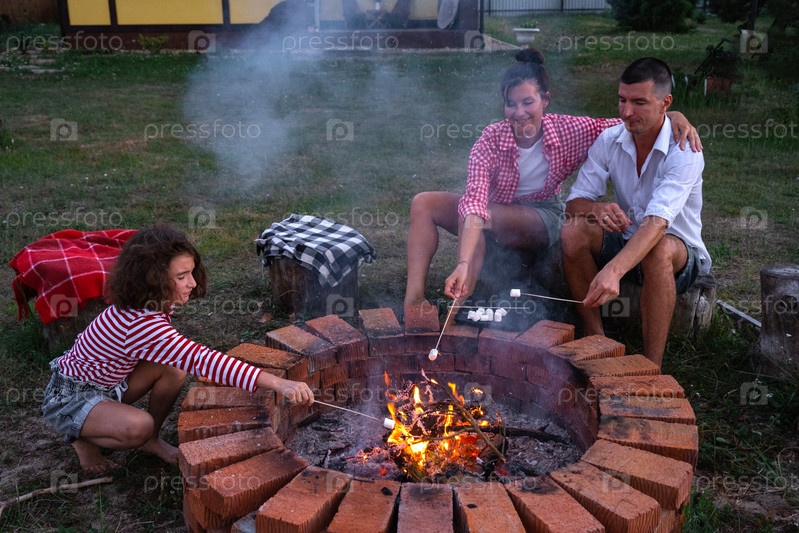 Семья мама, папа, дочь жарят зефир на шашлыках на костре в очаге во дворе дома у пожарной ямы уютным летним вечером
