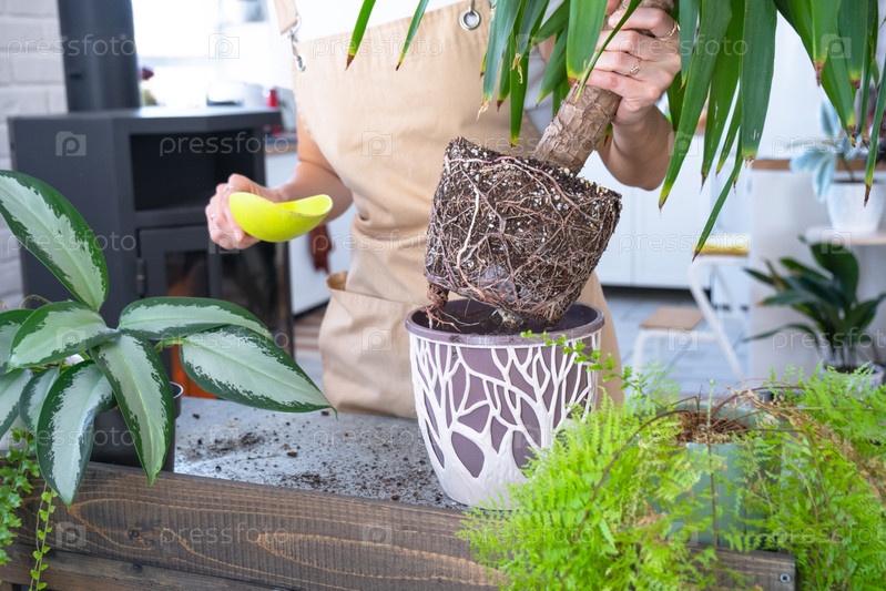 Пересадка и уход за домом растения Юкка в новый горшок в интерьере дома. Женщина разводит и выращивает растения хобби, держит тропическое растение Дракена
