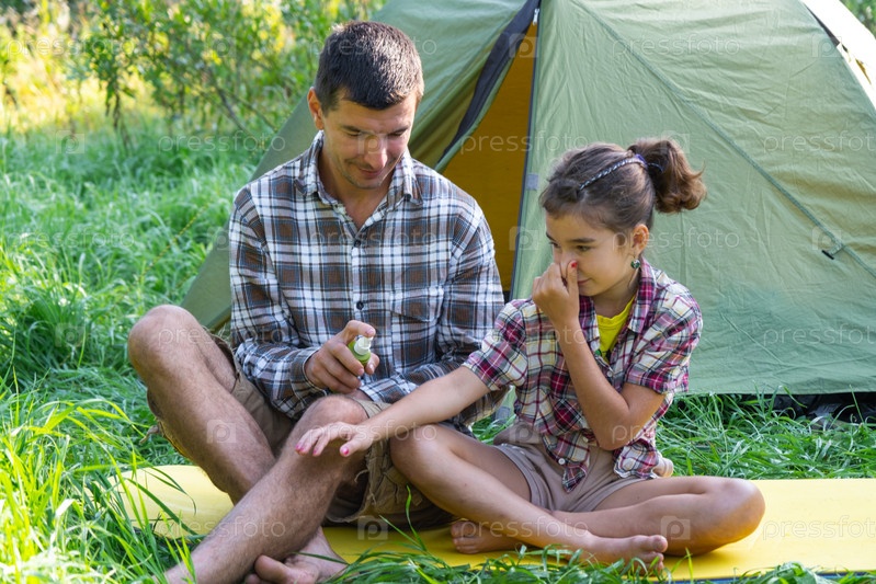 Папа распыляет репеллент на дочь на открытом кемпинге и пикнике возле палатки