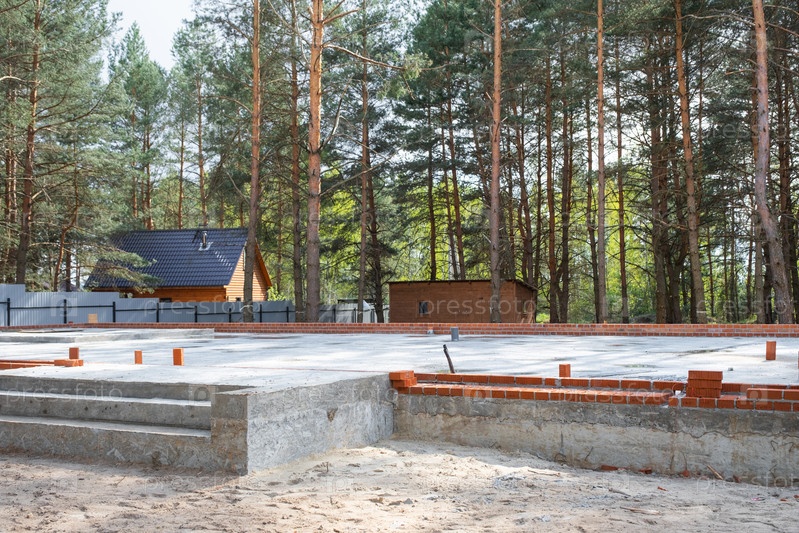 Бетонная плита фундамента дома с проложенными трубами начала строительства по проекту. Строительство коттеджей, проектирование, инженерные коммуникации