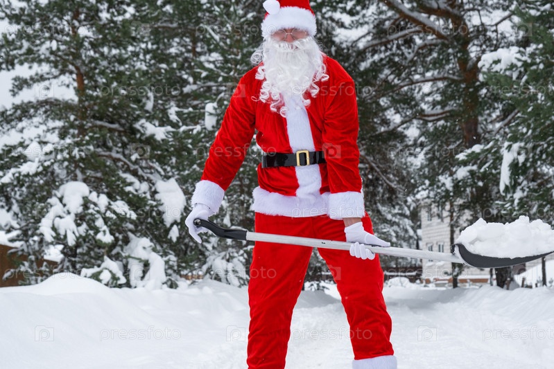 Санта-Клаус очищает снег лопатой зимой на открытом воздухе после снегопада. Уборка улиц в поселке, расчистка проезда для автомобилей, сложные погодные условия на Рождество и Новый год