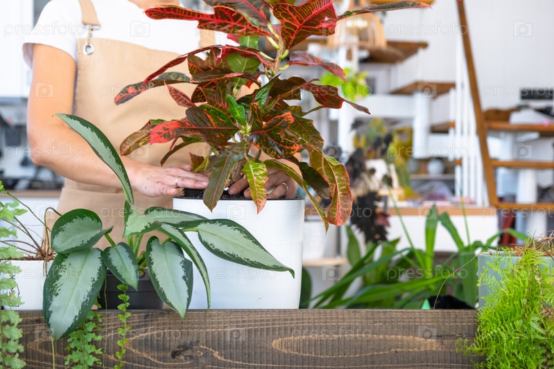 Пересадка и уход за домашним растением кодиевого кротона в новый горшок в домашнем интерьере. Женщина разводит и выращивает растения хобби, держит тропическое растение с красными листьями