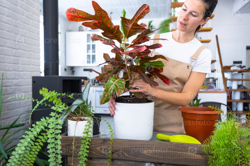 Пересадка и уход за домашним растением кодиевого кротона в новый горшок в домашнем интерьере. Женщина разводит и выращивает растения хобби, держит тропическое растение с красными листьями