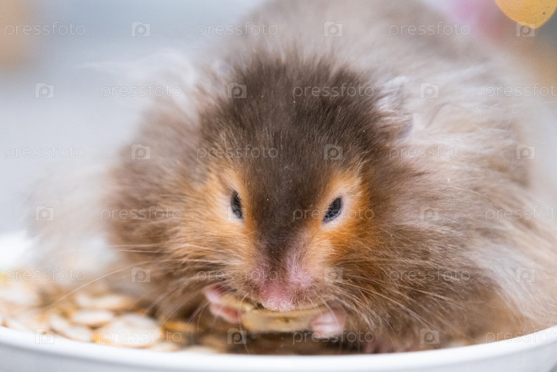 Забавный лохматый пушистый хомяк, сидящий в тарелке И ест семена на рождественском фоне с волшебными огнями и боке