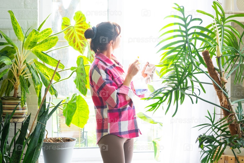 Женщина вручную моет окно дома тряпкой и шваброй внутри интерьера с домашними растениями. Восстановление порядка и чистоты весной, уборка сервиза