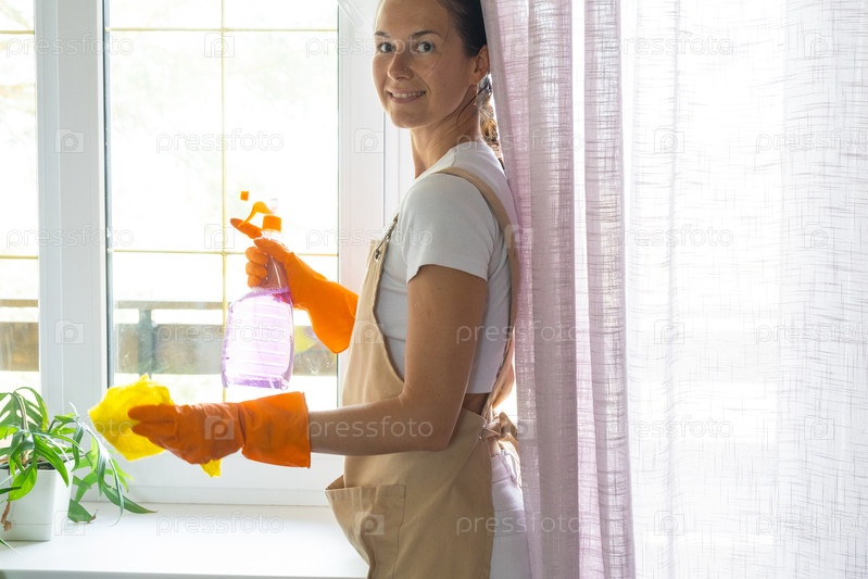 Женщина в резиновых перчатках и фартуке вручную моет оконный балкон дома тряпкой и шваброй внутри интерьера. Восстановление порядка и чистоты весной, уборка сервиза